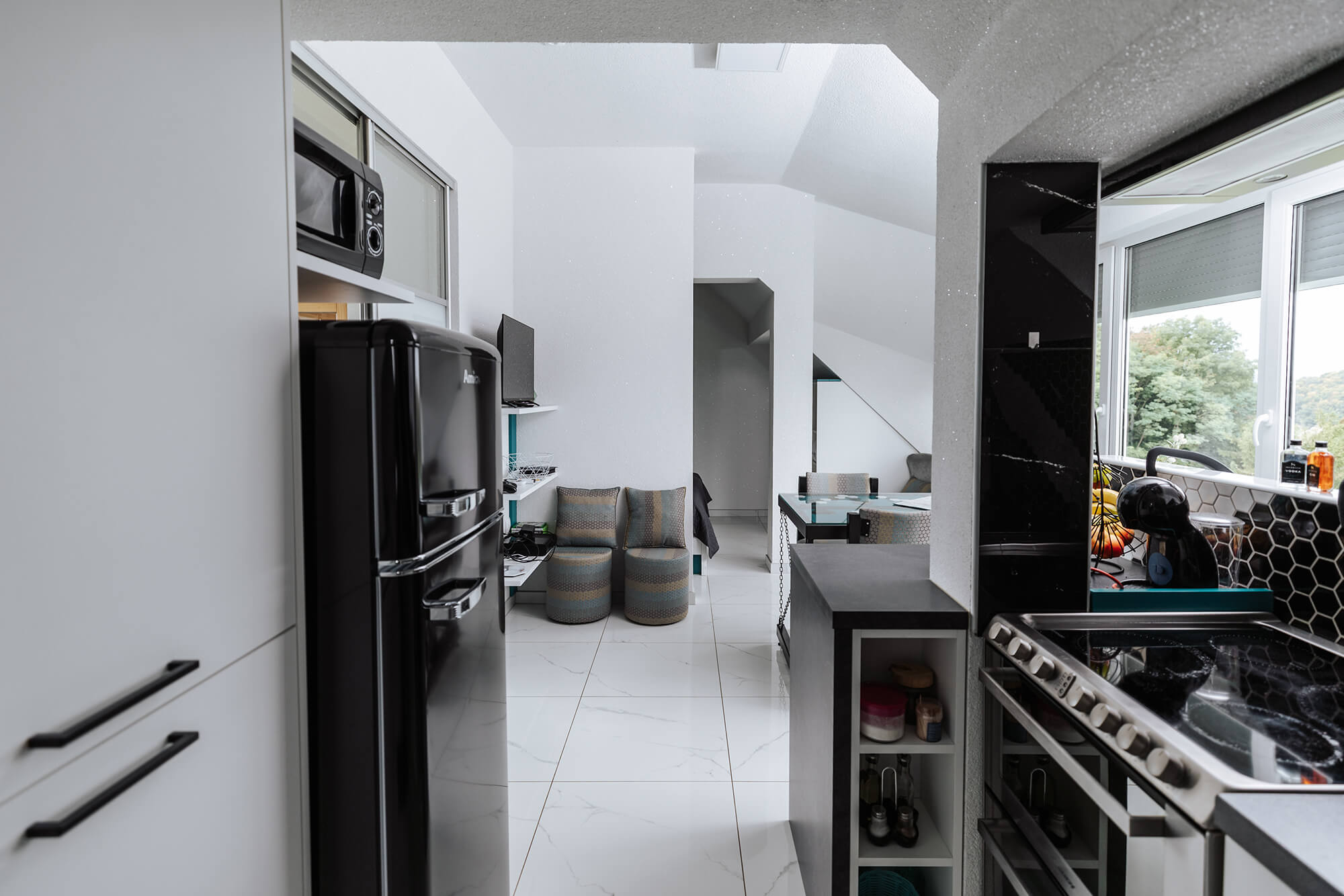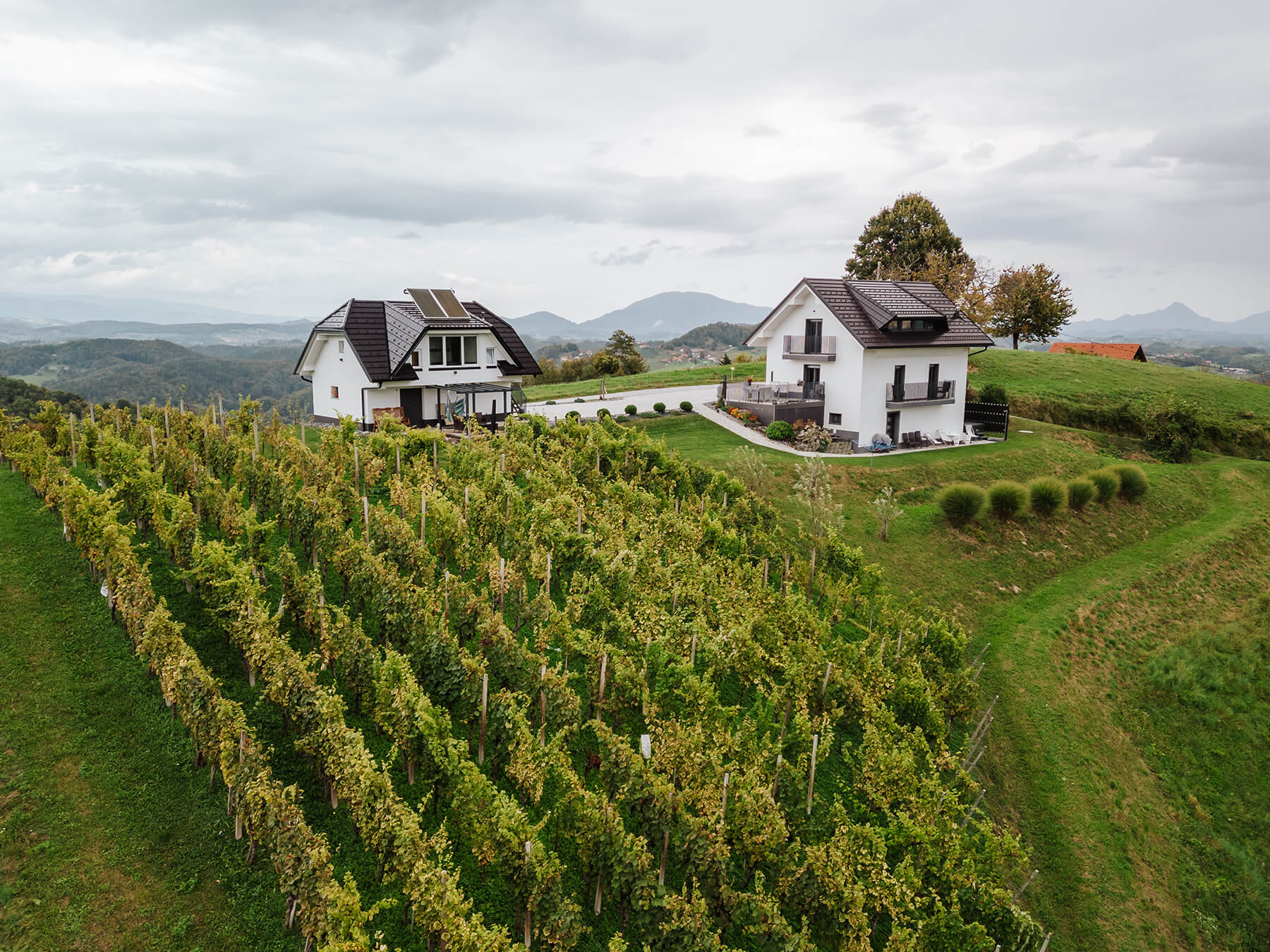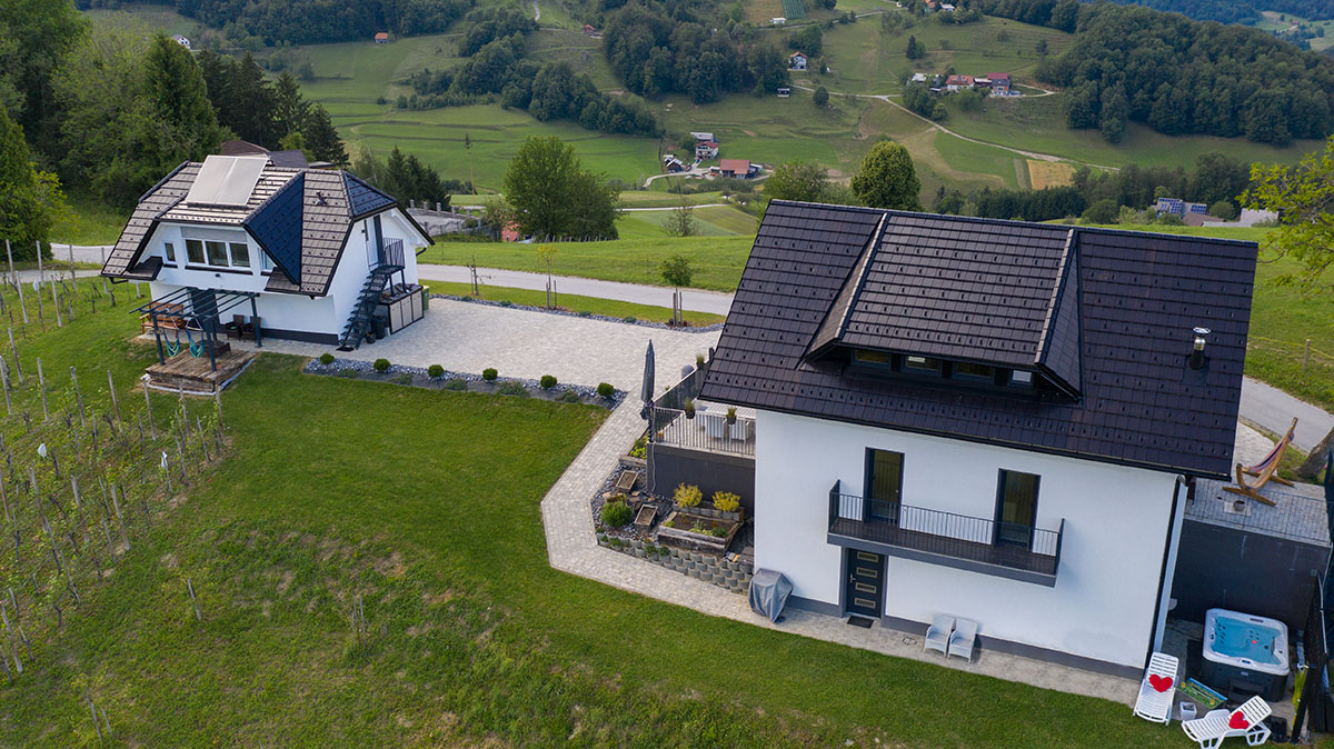 Our smaller house shelters a lovely studio apartment of 40 square meters on the first floor, ideal for couples and solo travelers. The holiday home features a bedroom, a fully functional kitchen, and a living area with a stunning panorama of the surrounding hills, including Pohorje, Boč, Donačka gora, and the well-kept fields of the nearby farms.
